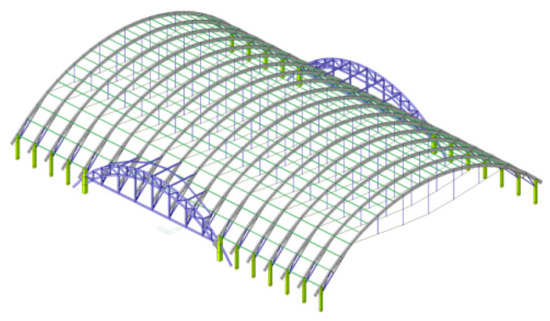 The Qin Eastern Mausoleum archaeological shelter project is located in Xi’an, Shaanxi Province, covering a total floor area of 16,020 m2 and designed with a seismic fortification intensity of 8 degrees. The project rendering is shown in Figure 1. This paper focuses on the central shelter, which adopts a tensioned aluminum alloy beam structure (TABS) comprising aluminum alloy arch beams and prestressed cables. With a height of 20 m, a span of 70 m, and column spacing of 5.5 m, it currently represents the largest-span tensioned aluminum alloy structure in China. The structural system consists of steel–concrete composite columns, aluminum alloy arch beams, tension cables, and struts.