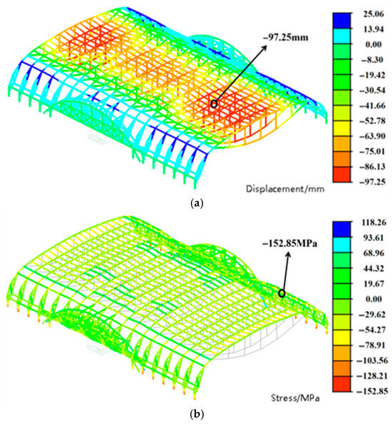 Structural response nephogram under SC1 condition. (a) Vertical displacement; (b) stress.