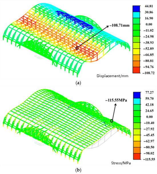 - Under the SC6-II load condition, the maximum vertical displacement of the structure is 108.72 mm. Compared with the SC6-I condition, the maximum displacement decreases by 3.54 mm under SC6-III and by 1.54 mm under SC6-IV. The relatively small variation in maximum vertical displacement across loading scenarios indicates that the snow load distribution pattern has only a limited influence on overall structural deformation.