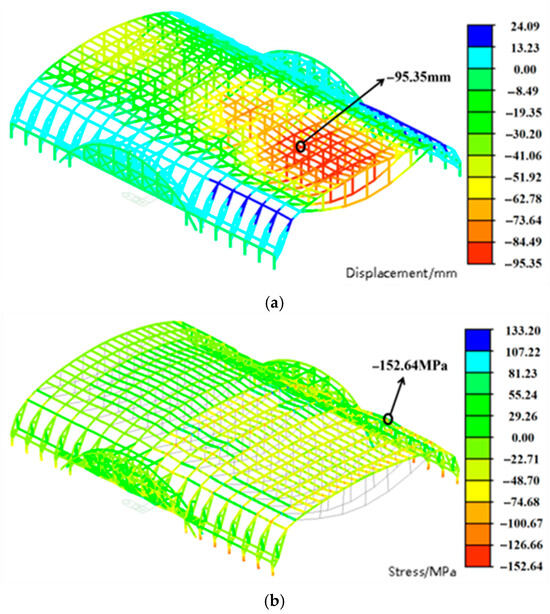 As summarized in Table 3, the maximum structural stress is 189.45 MPa, which remains below the yield strength of the aluminum alloy material, thereby satisfying the strength safety requirements. The average stress ratio is approximately 0.5, reflecting both a considerable safety margin and efficient use of material. The maximum vertical displacement is 137.31 mm, within the allowable deflection limit of span/250 as prescribed by the design code.