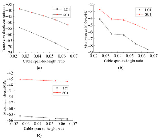 - Under both LC1 and SC1 loading conditions, the mid-span displacement increases approximately linearly with the cable sag-to-span ratio. When the ratio rises from 0.025 to 0.065, the mid-span displacement increases by 33.51%.