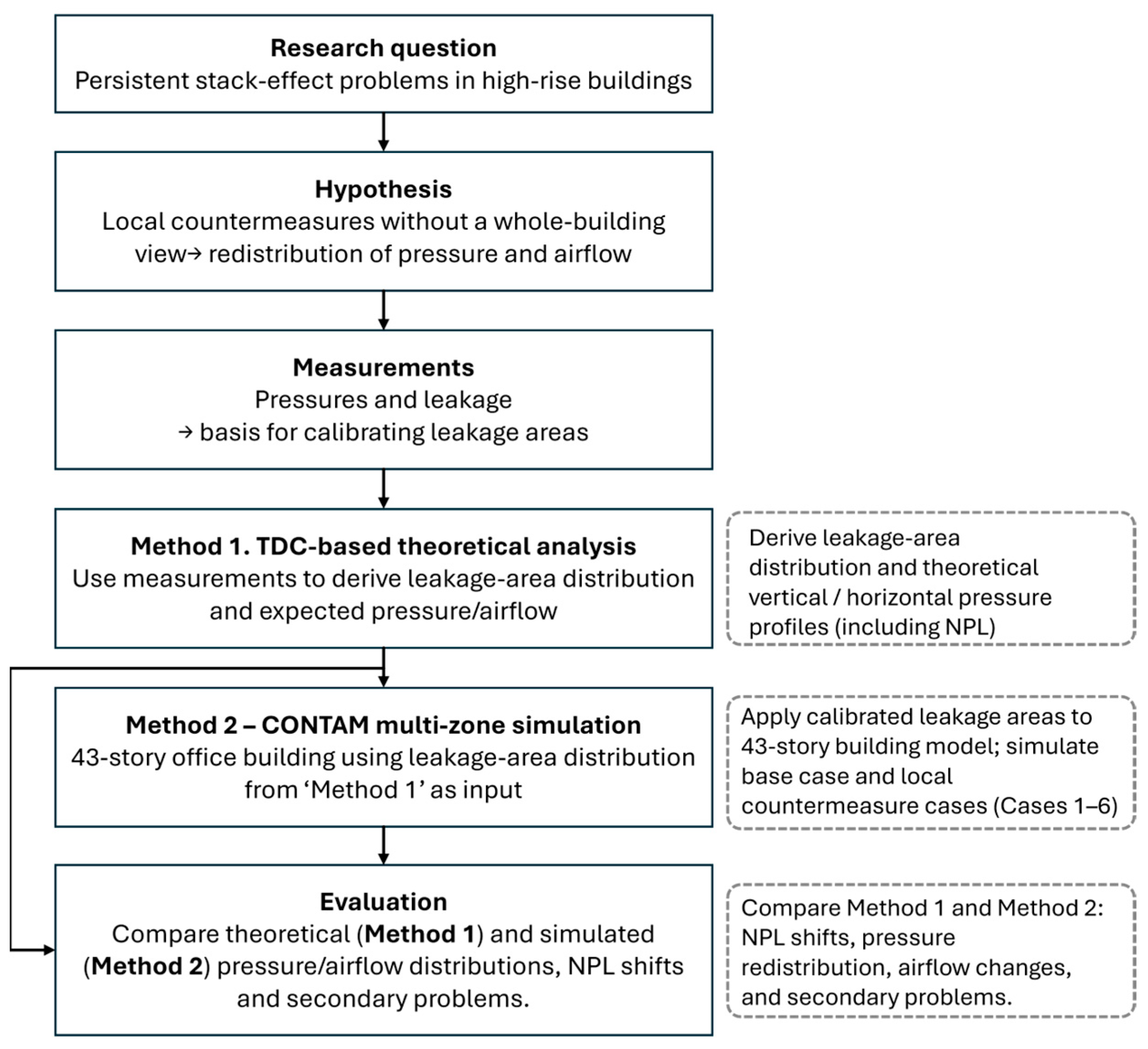 Nevertheless, stack-effect problems in high-rise buildings continue to be reported. One important reason is that the examination and application of countermeasures have generally focused on the specific locations where problems are observed (for example, a particular elevator hall or lobby), without sufficiently considering the coupling of pressures and airflow throughout the building. In particular, the movement of the neutral pressure level (NPL) and the redistribution of pressure differences among floors and compartments have rarely been analyzed from a whole-building perspective, even in recent studies on pressurization, zoning, and HVAC-based control [