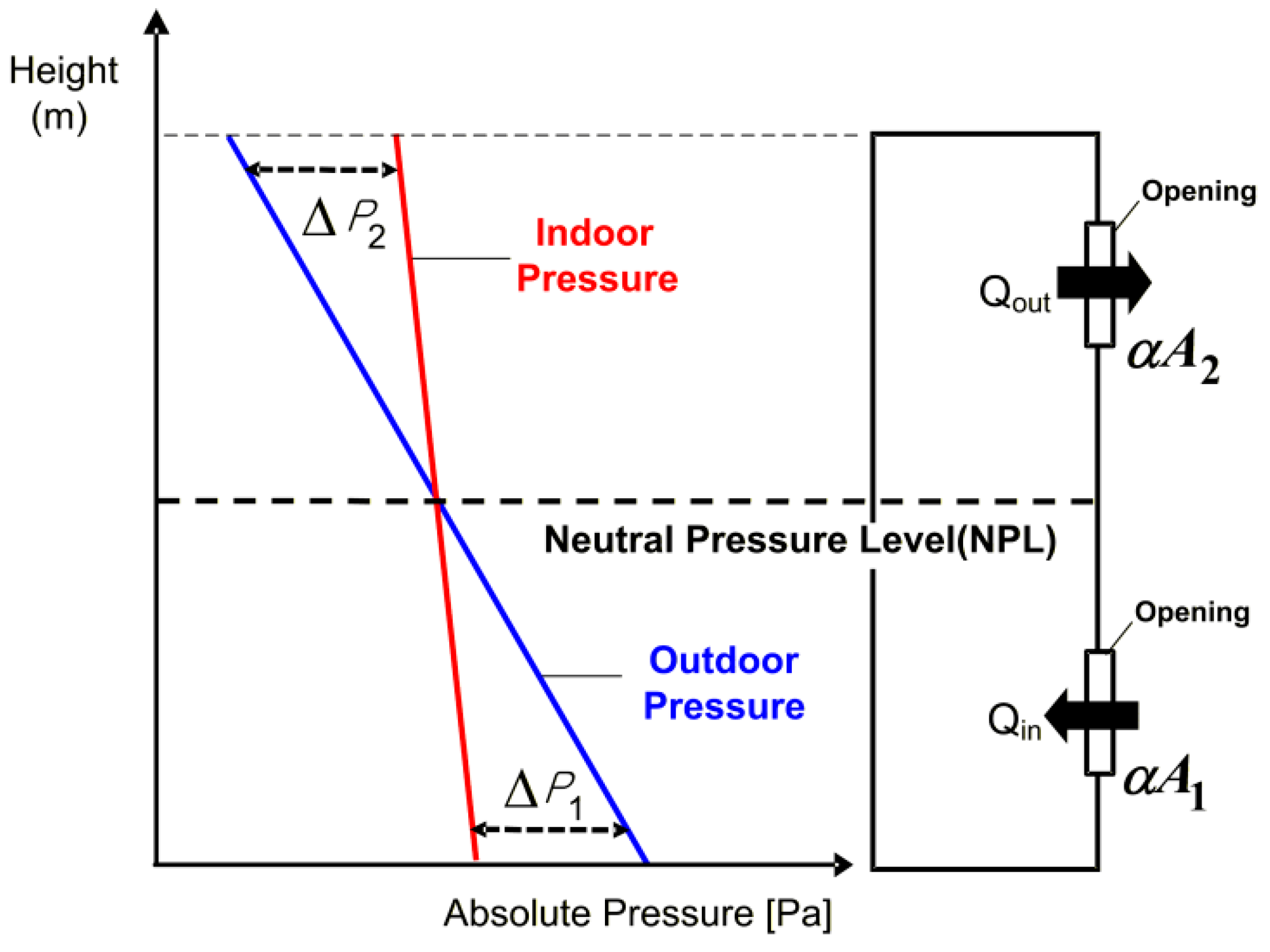 Figure 2, the vertical pressure distribution in a building under the stack effect is governed by the location of the neutral pressure level (NPL) and the indoor–outdoor temperature difference. At the NPL, the indoor and outdoor absolute pressures are equal; above and below this level, their magnitude relation is reversed.