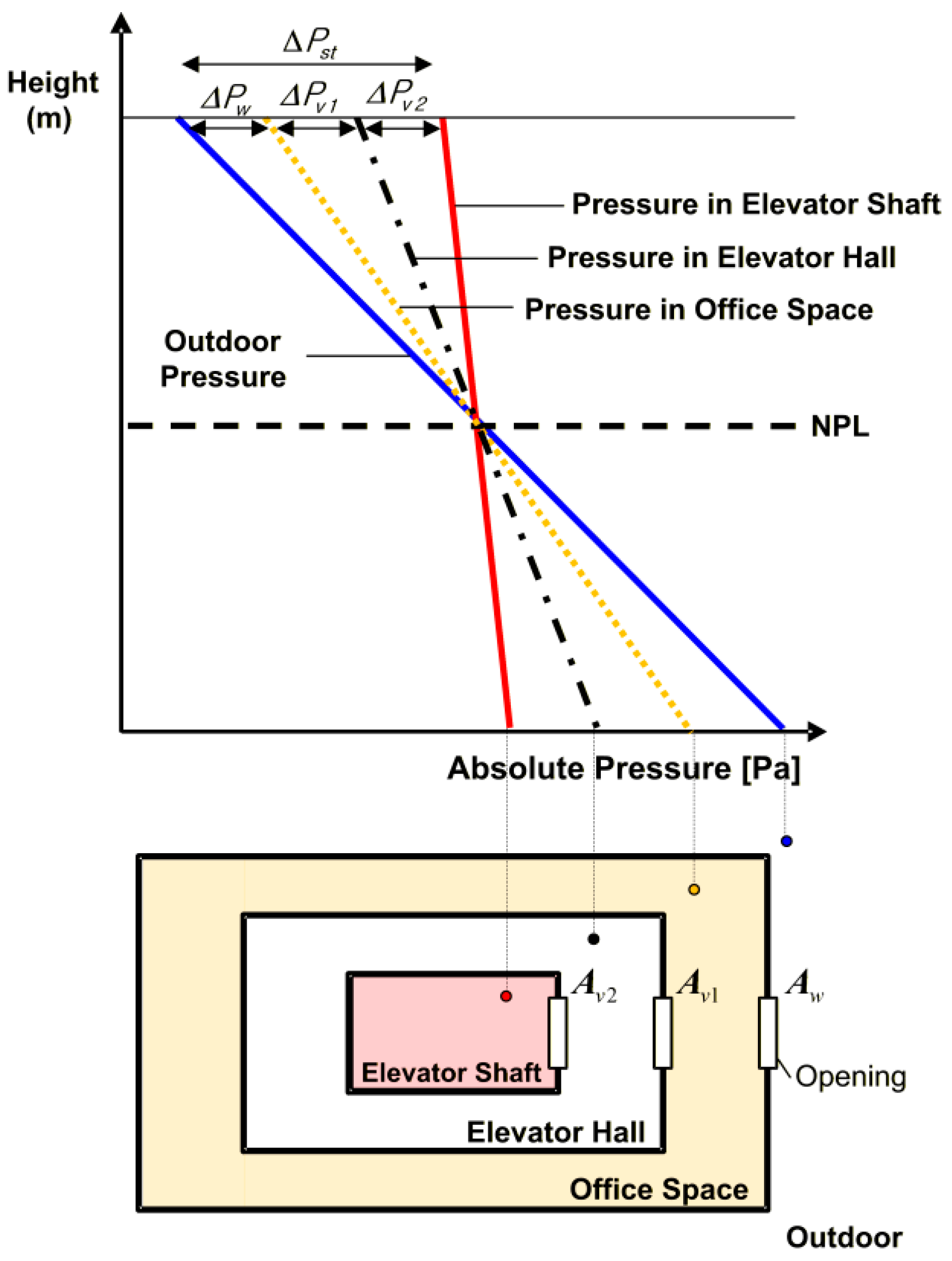 The gradients of indoor and outdoor absolute pressure are determined by their respective air temperatures, so the same indoor–outdoor pressure difference occurs at the same vertical distance from the NPL, regardless of the absolute height of the NPL. In the target 43-story office building, these principles are applied mainly to the high-rise elevator shaft, which has its own NPL and dominates the stack-effect problems observed at 1 F and 40 F.
