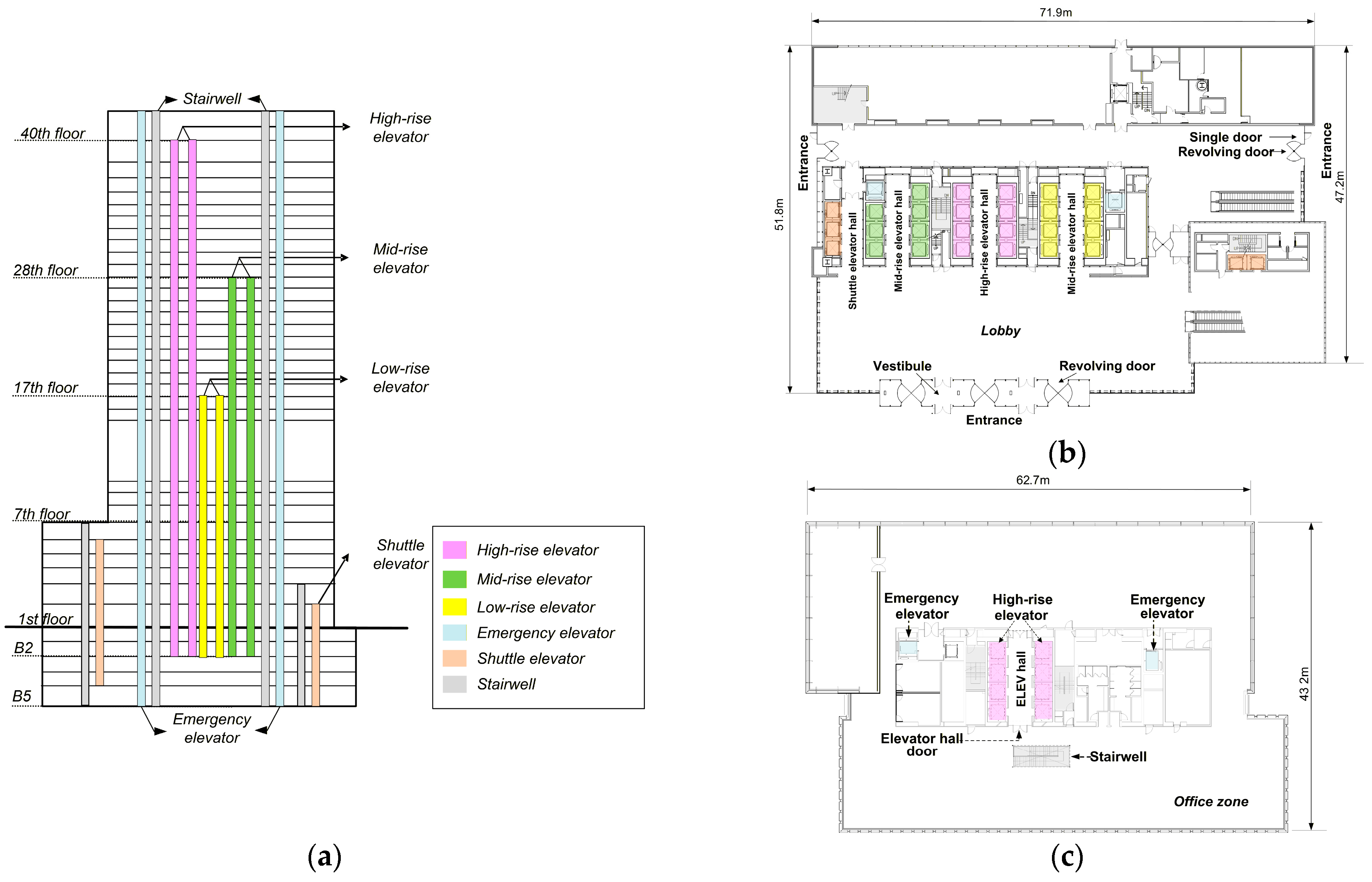 The passenger elevators are operated separately for low-rise (1 F–17 F), med-rise (1 F, 17 F–28 F), and high-rise (1 F, 28 F–40 F). The passenger elevator system consists of two pairs of shafts facing each other, with four elevator cars operated in each shaft. The shuttle elevators operate between the B7 and 4 F, and the emergency elevators serve all floors. The target building has a center core plan, an elevator hall, and interior doors are installed on all floors except for the first floor. Revolving doors are installed at the main and secondary entrances on the first floor.