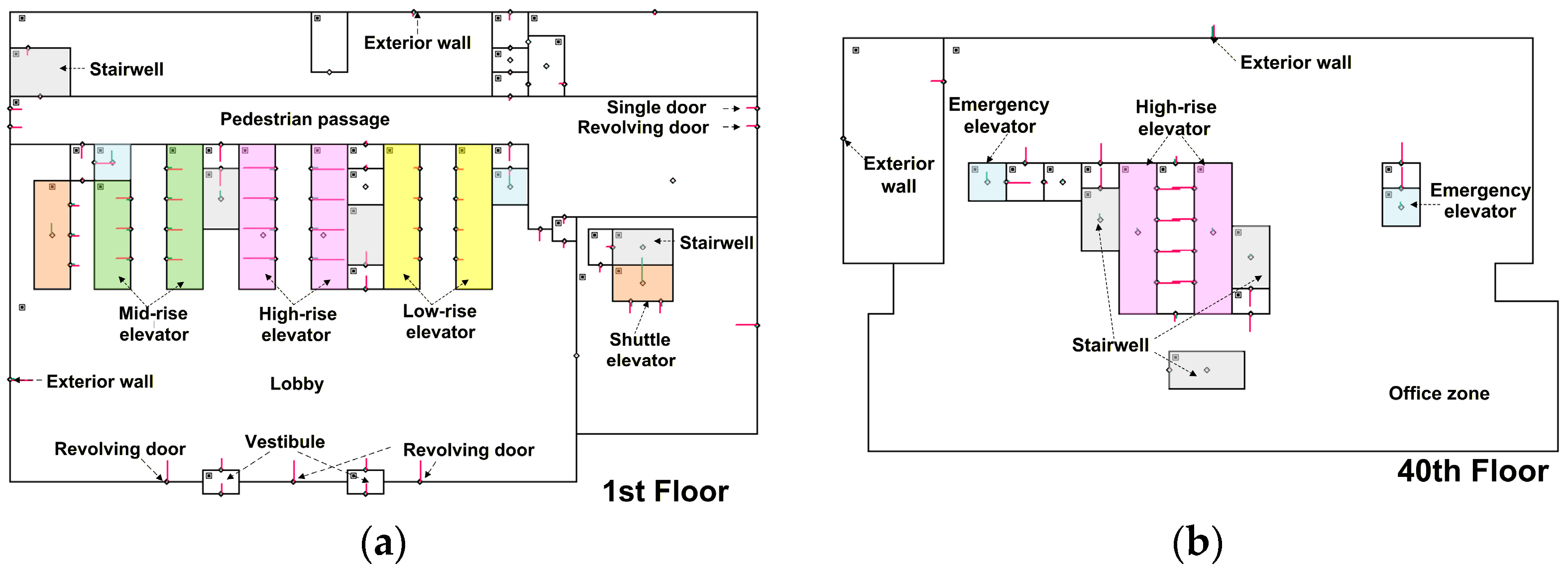 Figure 3 and Equations (4)–(8) consider a simplified floor divided into the exterior and two interior divisions: the interface between the indoor space and the elevator hall, and the interface between the elevator hall and the elevator shaft.