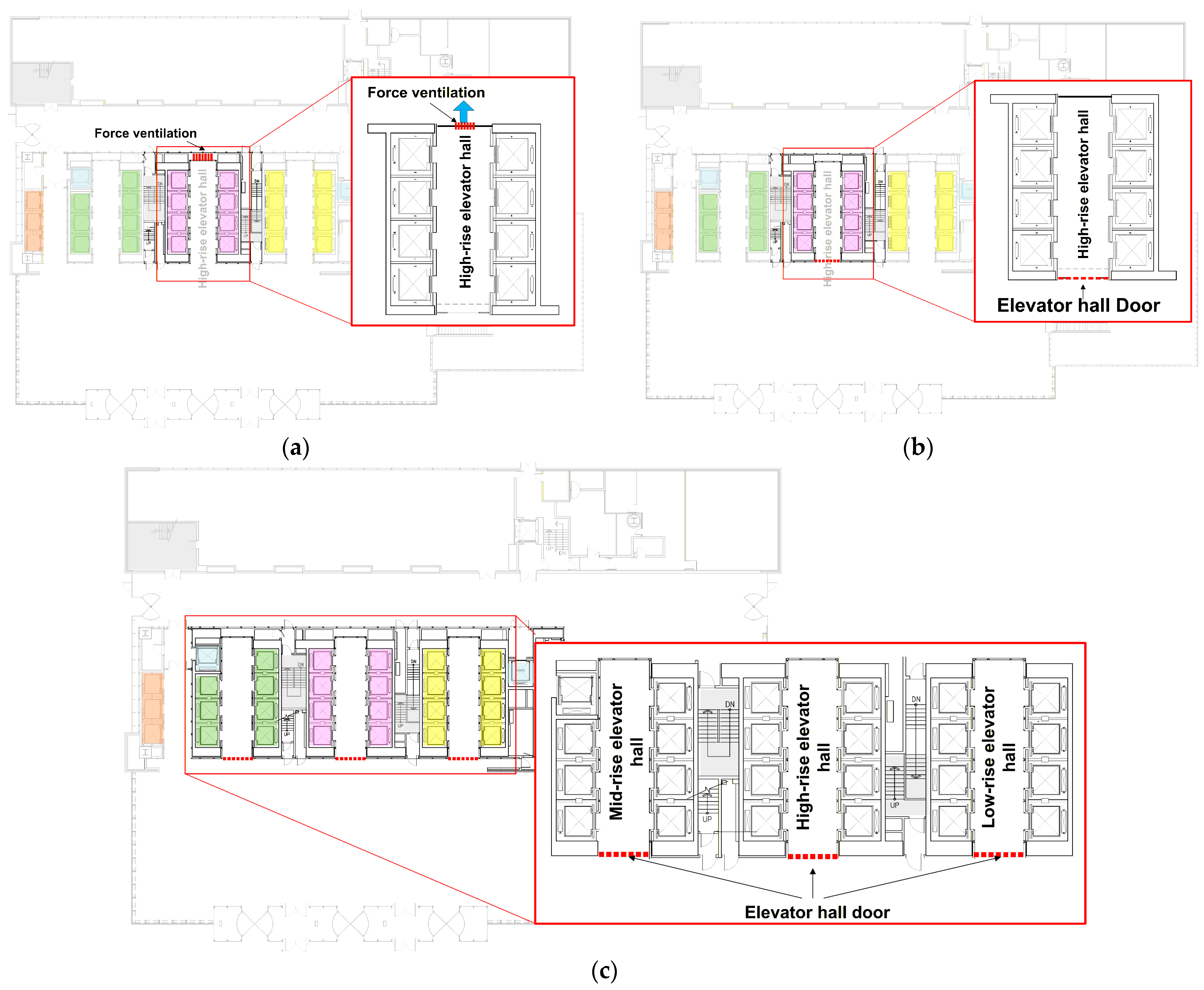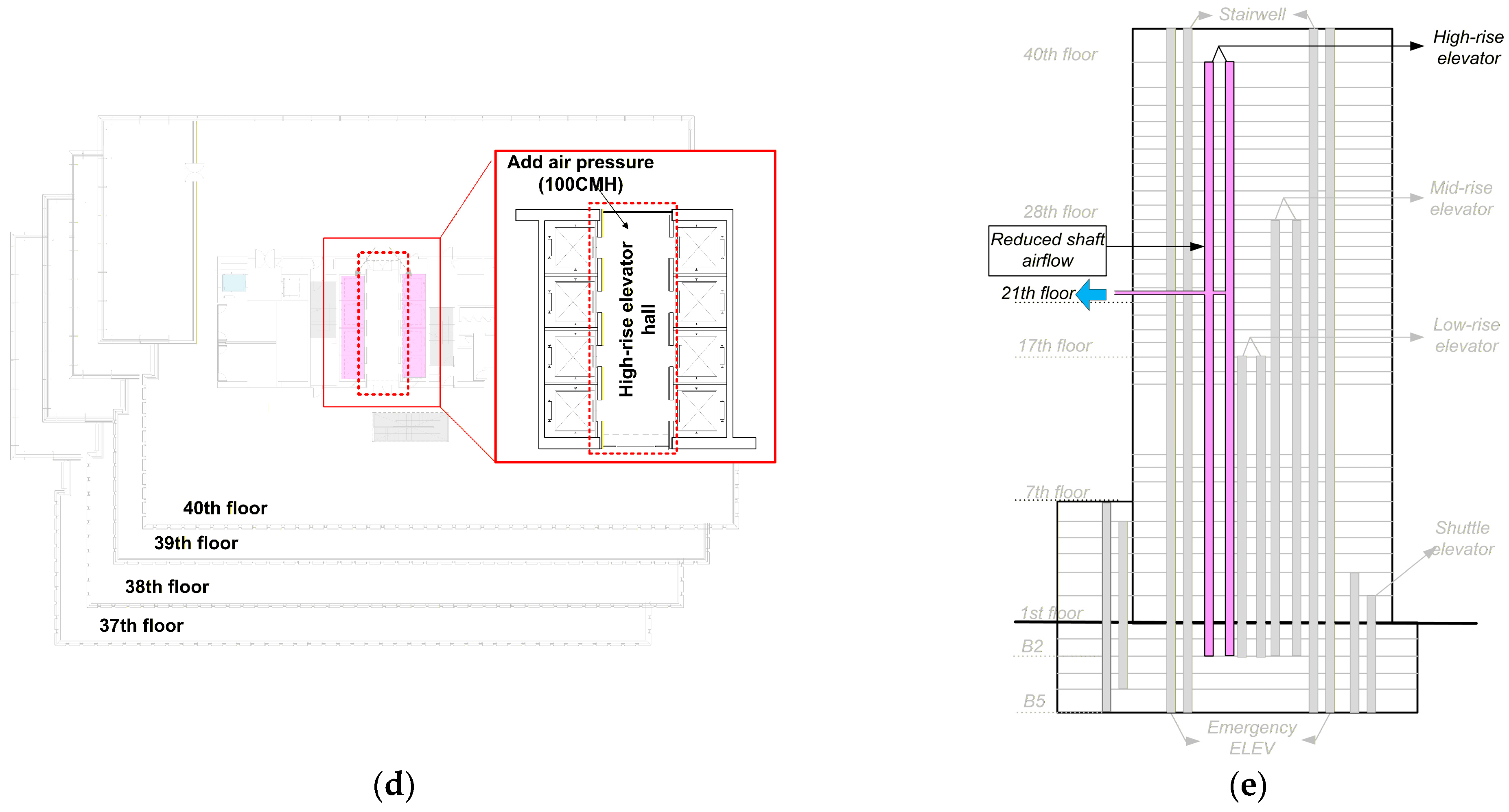 Figure 3 correspond to the high-rise elevator shaft, the high-rise elevator hall, and the adjacent office/vertical-circulation zones on 1 F and 40 F. The local countermeasures investigated in
