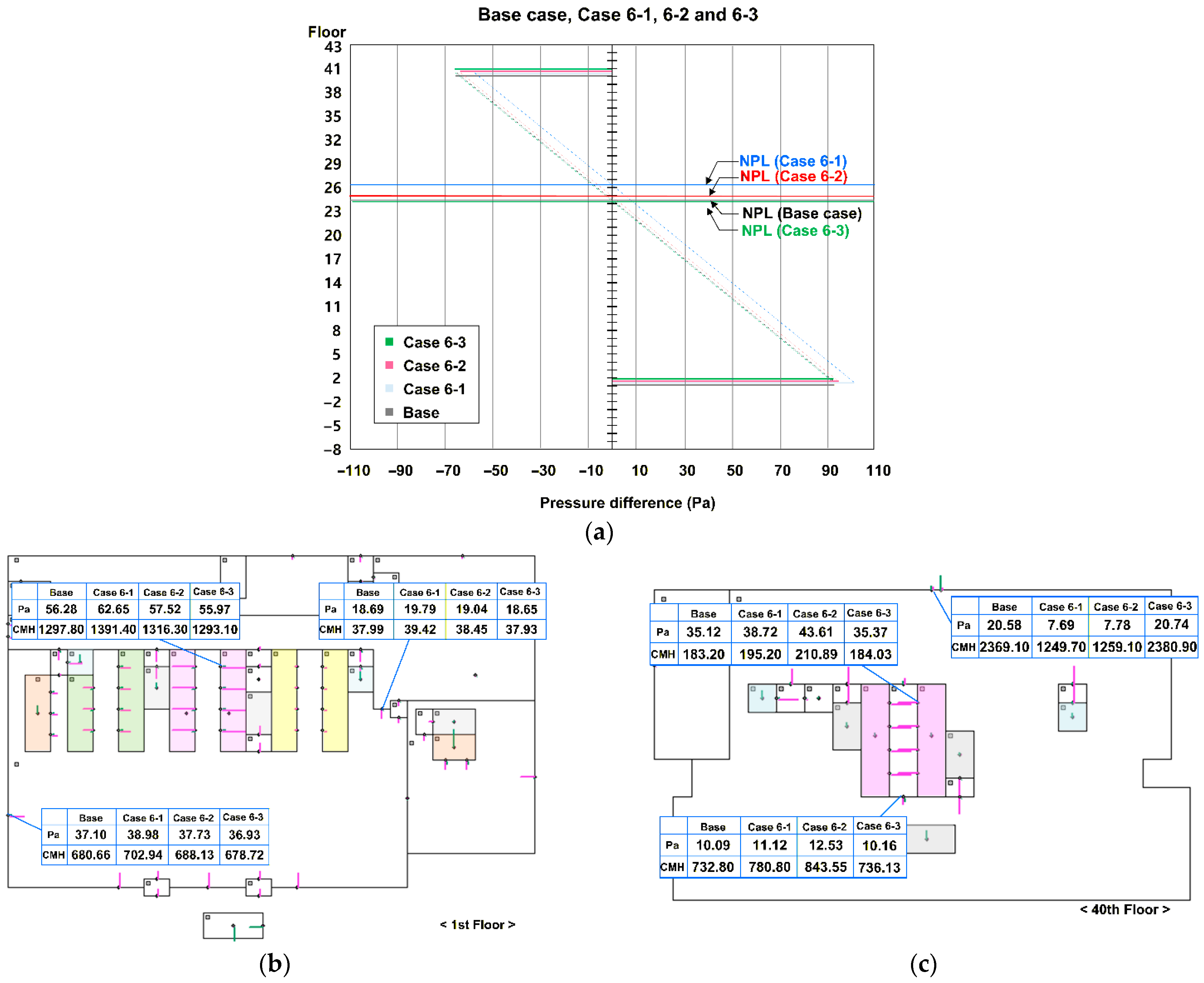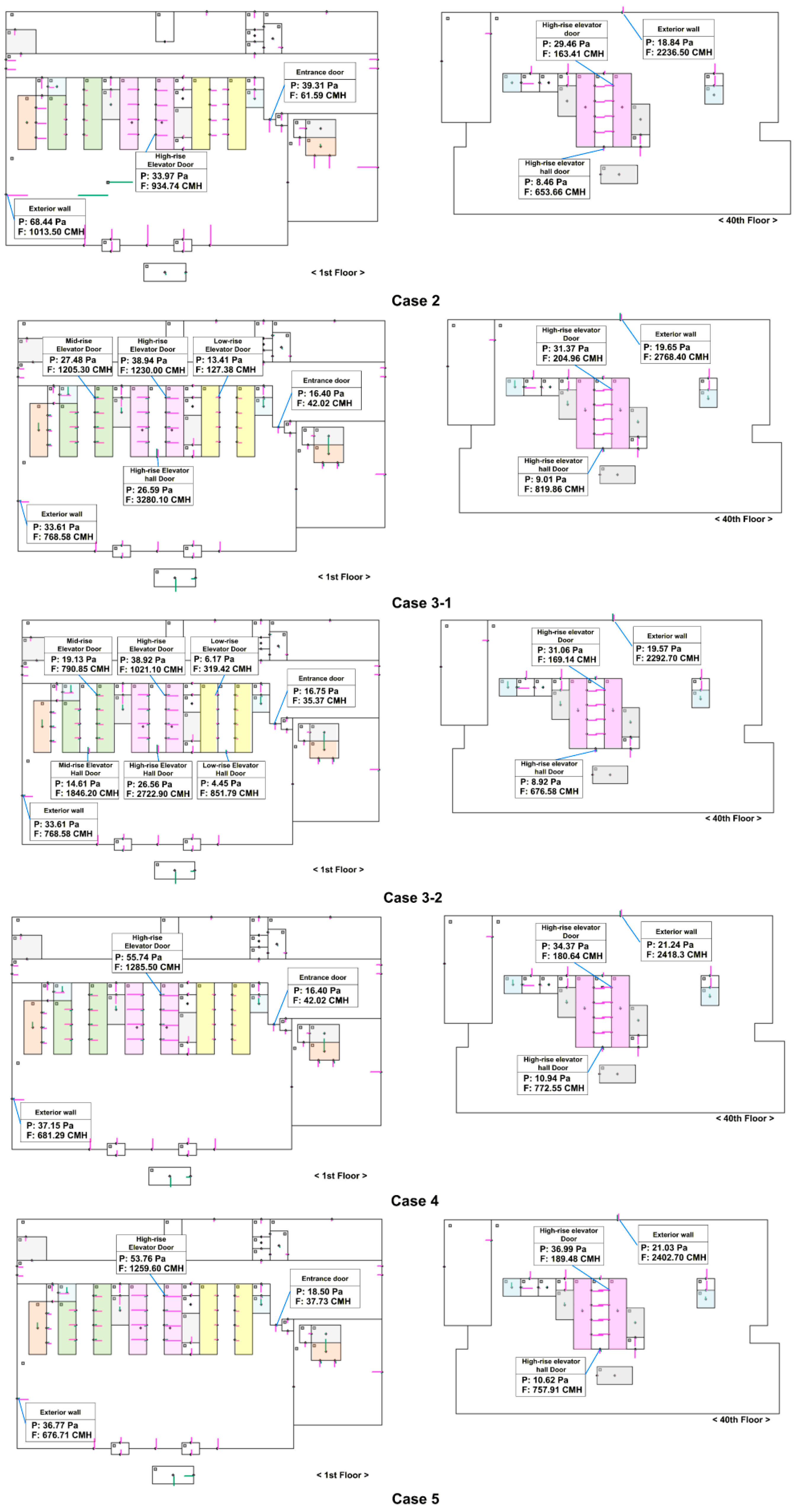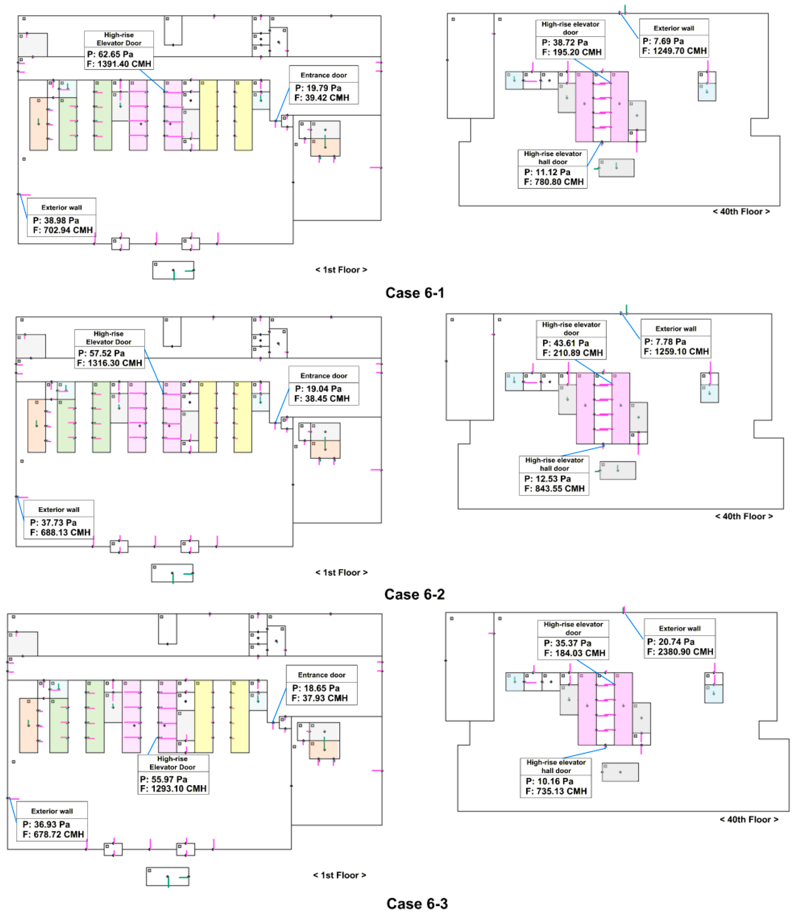 Figure 11b,c show the horizontal pressure differences and airflow on 1 F and 40 F, respectively. When separate ventilation is applied through duct, the pressure difference at each division on the high-rise floors, where the countermeasure was intended to mitigate the problems, increase while the pressure differences on 1 F decrease (