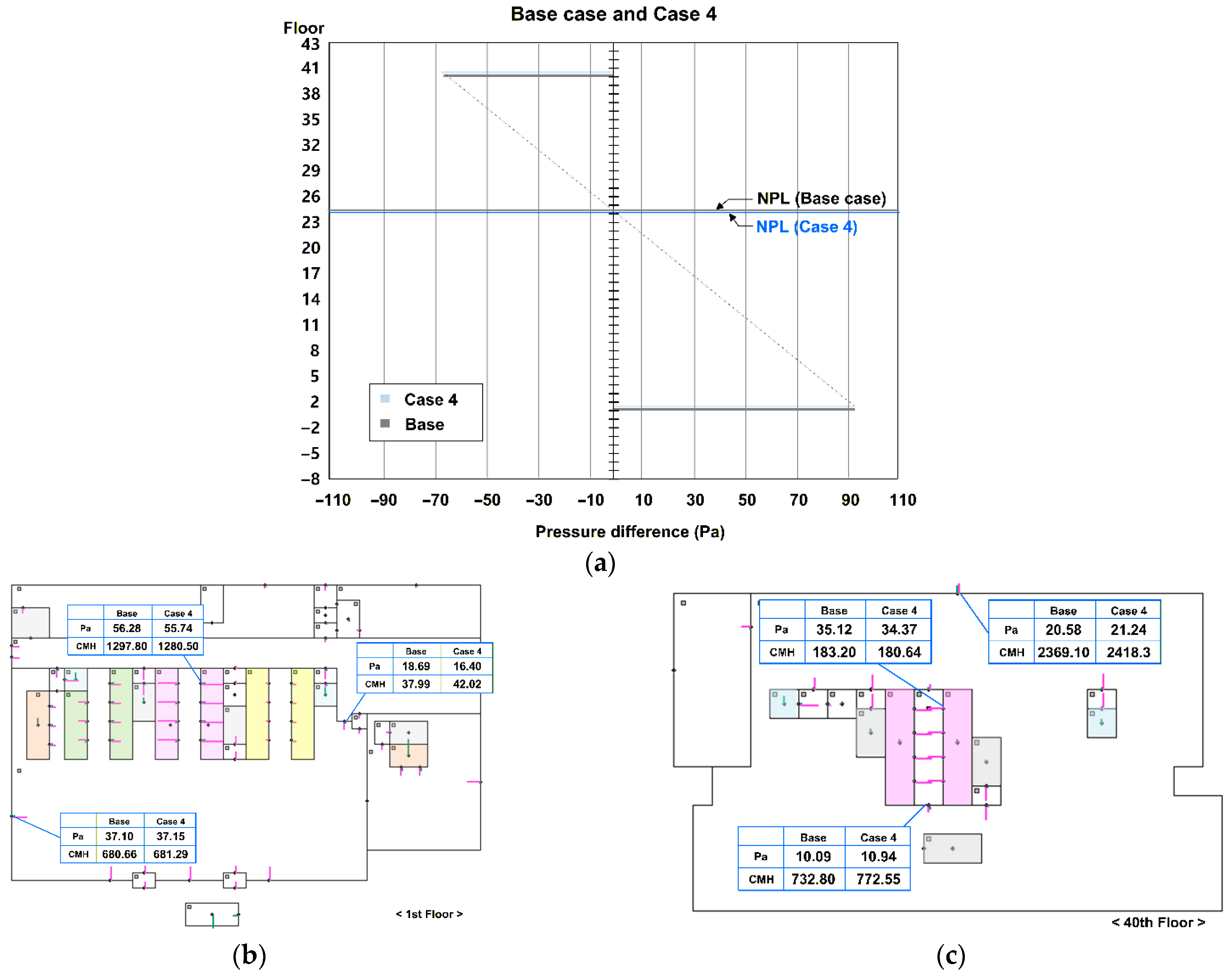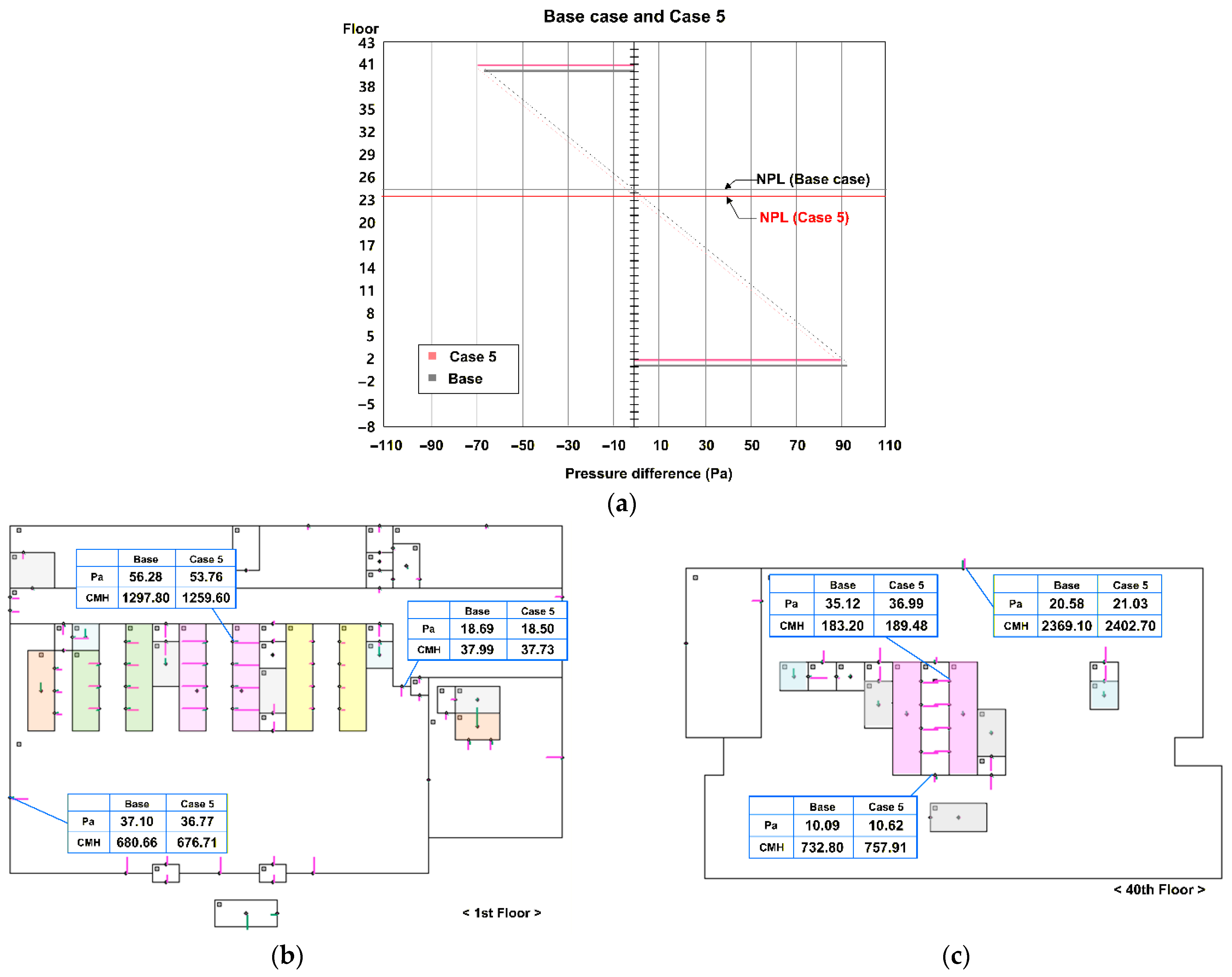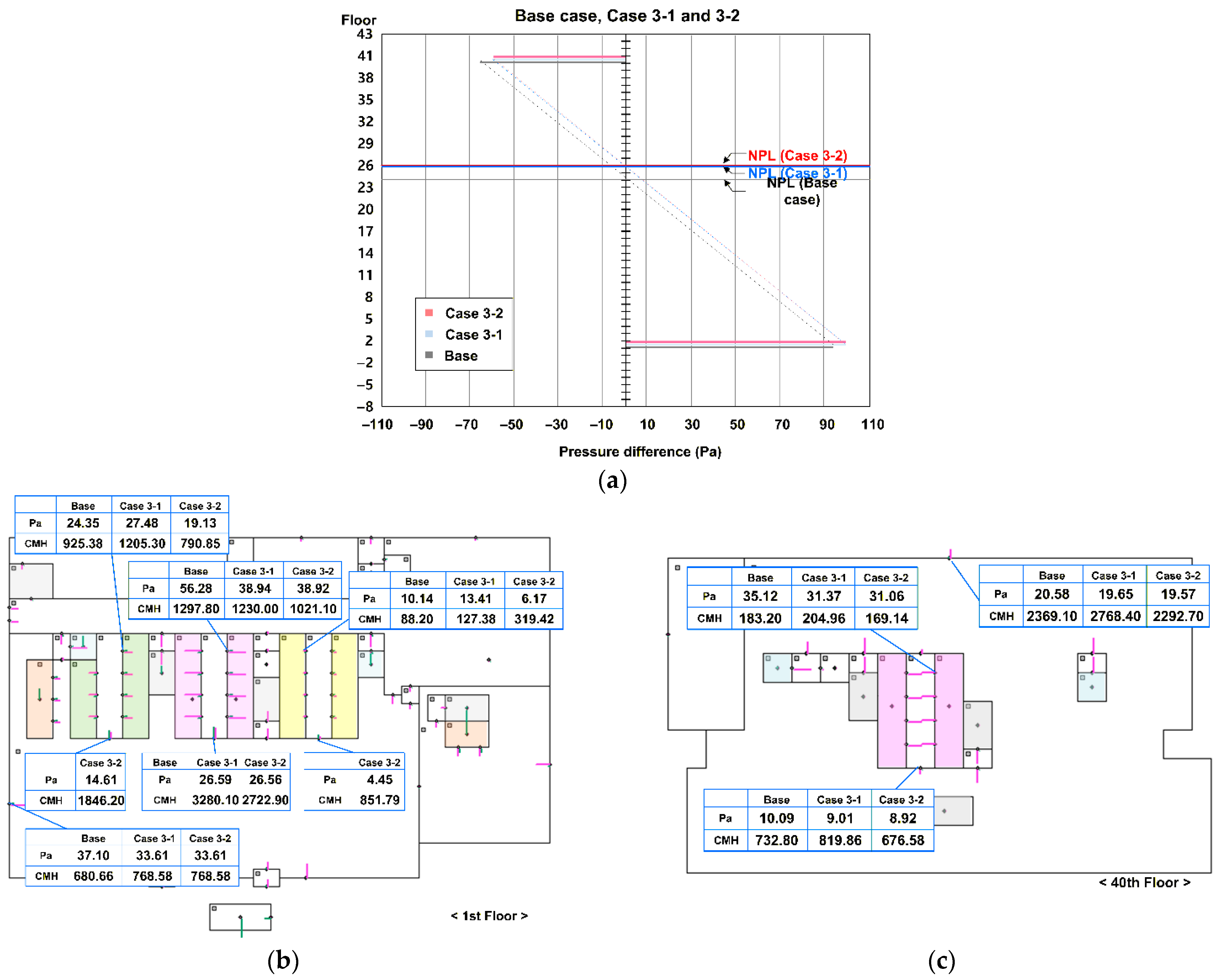 Figure 11b,c show the horizontal pressure differences and airflow on 1 F and 40 F, respectively. When separate ventilation is applied through duct, the pressure difference at each division on the high-rise floors, where the countermeasure was intended to mitigate the problems, increase while the pressure differences on 1 F decrease (