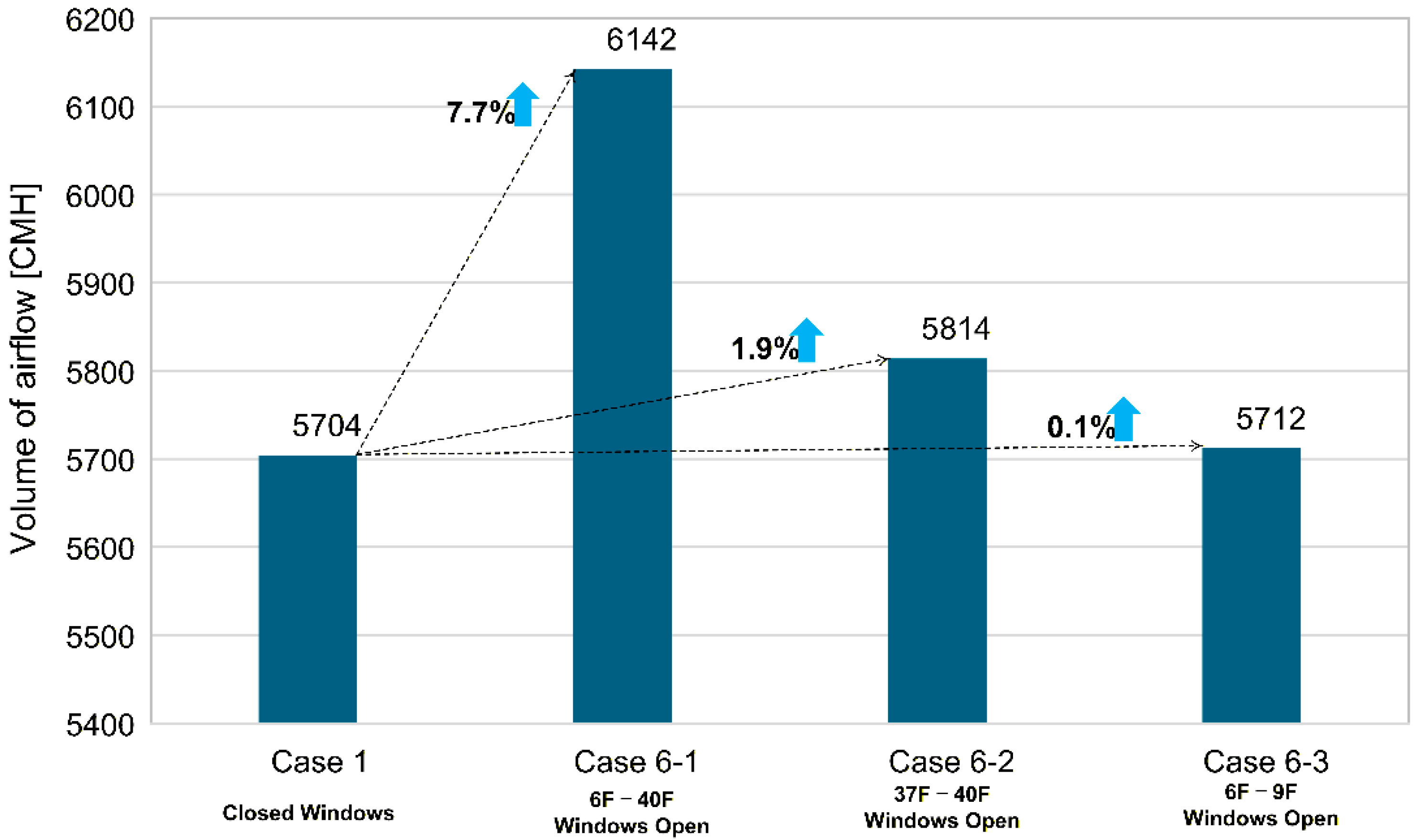 Figure 13 summarizes the airflow rate in the high-rise elevator shaft for the base case and the window-opening cases (Cases 6-1, 6-2, and 6-3). More detailed vertical and horizontal pressure distributions for individual cases are provided in