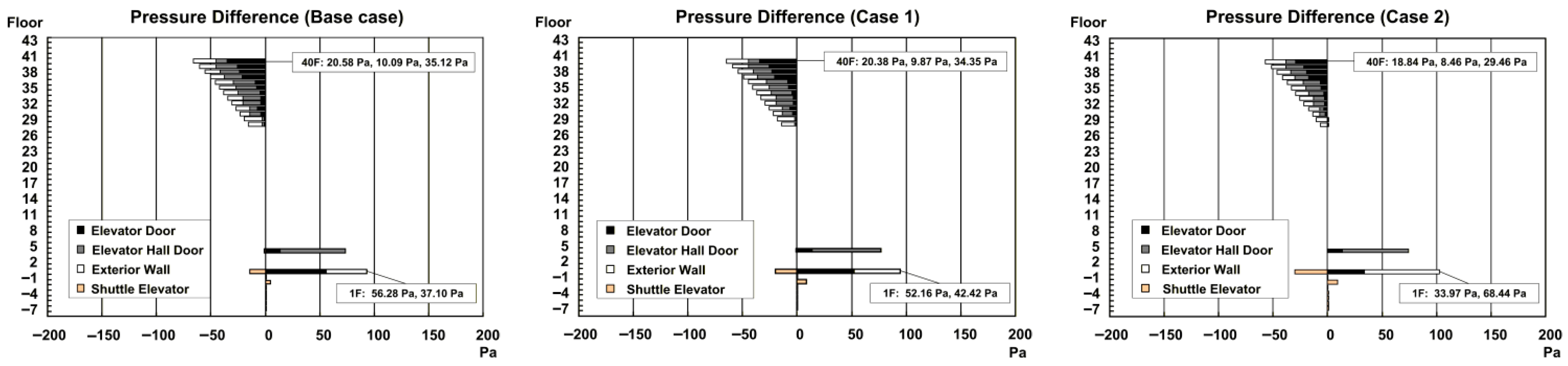 Figure 8b). In other words, the pressure difference acting on the high-rise elevator doors on 1 F is reduced. This means that the application of these countermeasures mitigates the stack-effect problems at the first floor, such as noise and strong wind when the elevator doors are opened.