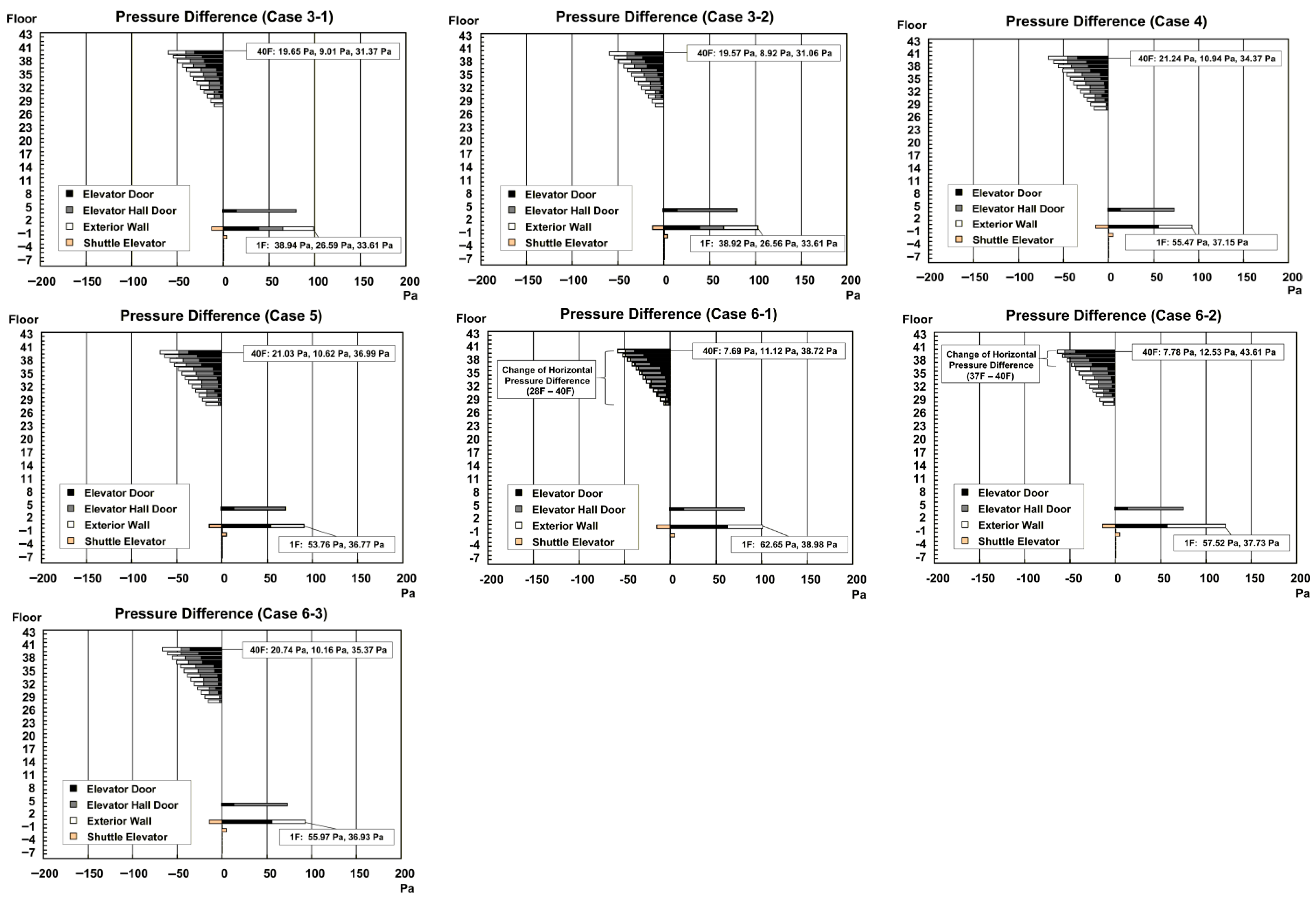 Figure 12c, when the exterior windows are opened on floors where the high-rise elevator is available (Cases 6-1 and 6-2), the horizontal pressure distribution on those floors changes significantly owing to the change in the leakage area of the exterior wall. As the exterior windows are opened, the relative leakage area of the exterior wall increases on each floor, most of the stack-effect pressure difference that previously acted on exterior wall is transferred to the elevator shaft and elevator hall. Consequently, the pressure differences increase on both the elevator doors and elevator hall doors, which can increase the severity and probability of stack-effect problems.