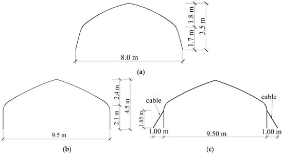 Cross-sectional diagrams of plastic greenhouse frames: (a) 8.0 m span frame; (b) 9.5 m span frame; (c) reinforced frame.
