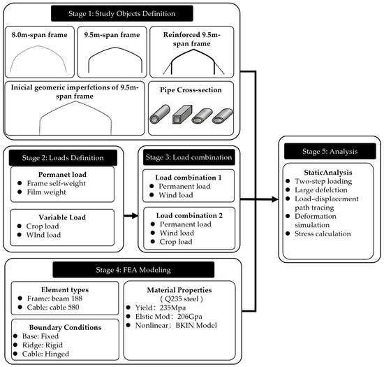 Despite existing studies, a systematic understanding of the structural stability differences between standard 8.0 m and large-span 9.5 m frames under wind loads in Southern China is still lacking. Specifically, the quantitative influence of this structural dimension increment on the frame’s initial stiffness, wind-induced response characteristics, and specific failure modes remains unclear. Moreover, Solanaceous crops are typically suspended directly from the frames, subjecting the frames to simultaneous wind and crop loads. Additionally, initial geometric imperfections arising from manufacturing and construction errors are inevitable. However, it remains to be elucidated whether these factors could amplify second-order effects, accelerate stiffness degradation, and thereby compromise the frame’s wind-bearing capacity mechanism. Finally, in addition to traditional circular steel pipes, advancements in construction technology have introduced alternative cross-sections such as square, rectangular, flat oval, and oblate elliptical shapes, as well as temporary reinforcement measures. Nevertheless, the specific mechanisms by which these factors influence the structural stability and failure behavior of the frames remain to be fully elucidated.