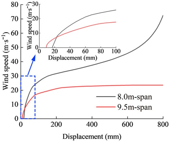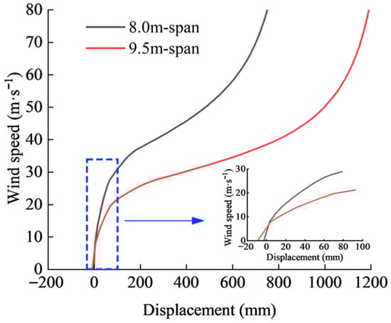 In this study, displacements in the windward direction were considered positive. Figure 8 illustrates the ‘wind speed–displacement’ curve for the windward eave of the 8.0 m and 9.5 m span frames under load combination 1. Initially, the windward eave exhibited negative displacements due to the permanent loads. Then, the displacements increased with the wind speed following a cubic function form. Meanwhile, the 8.0 m span frame showed a much steeper curve in the initial loading stage, whereas the 9.5 m span frame exhibited a noticeably flatter one. The results imply that the expansion of frame span from 8.0 m to 9.5 m led to a reduction in the frame’s initial lateral stiffness.