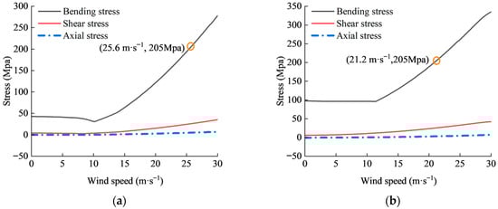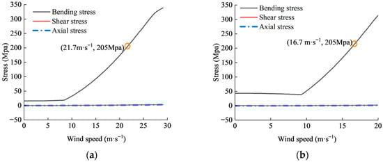 Maximum bending, axial, and shear stresses in frames under load combination 1: (a) 8.0 m span plastic greenhouse; (b) 9.5 m span plastic greenhouse.
