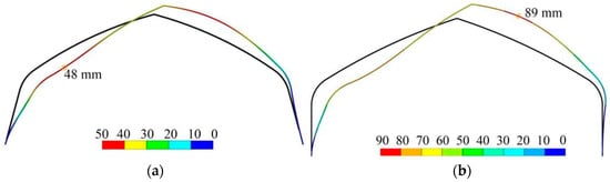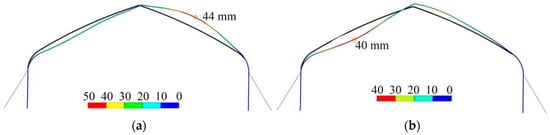 Deformations of frames under load combination 1 (magnified tenfold for clarity): (a) 8.0 m span plastic greenhouse; (b) 9.5 m span plastic greenhouse. Black line represents the undeformed frame, while the colored line represents the deformed frame.