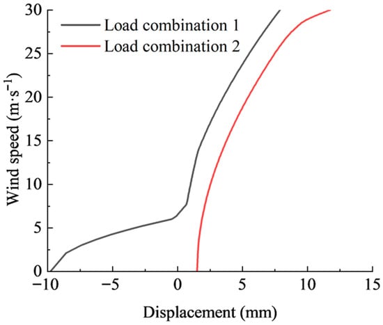 Figure 15 illustrates the relationship between wind speed and the horizontal displacement of the windward eave for the 9.5 m span reinforced frame. Under load combination 1, the frame initially deforms outward at the shoulders due to permanent loads, resulting in a relaxed state of the reinforcement cables. As the wind speed increases, the cables gradually tighten and begin to restrain further deformation of the frame. In contrast, under load combination 2, the presence of crop loads causes the reinforcement cables to be taut from the outset, thereby limiting the frame deformation from the beginning. These curves indicate that the reinforced frames did not show any buckling failure within the horizontal displacement range of the windward eaves under both load combination 1 and 2. The results indicated that the cables act as a strong lateral constraint that restricts the displacement of the windward eave. As a result, the P-Δ effect moments amplified by crop loads were limited and thus avoided the increment of lateral displacement.