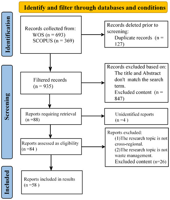 The PRISMA method is a popularly adopted systematic review method [10]. To systematically and comprehensively present the research landscape of cross-regional waste management, this study adheres to the PRISMA statement for literature retrieval, screening, and analytical processing. Additionally, Table S1: The PRISMA checklist facilitated the scientific preparation and reporting of this study. This study has been registered in the OSF Registry with the DOI: https://doi.org/10.17605/OSF.IO/KEW8C.
