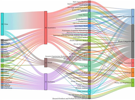 This section presents a Sankey diagram based on the authors’ countries of affiliation, methodological approaches, and research themes, as shown in Figure 3.