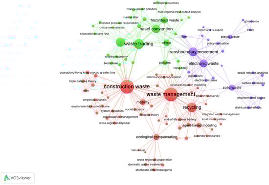 As evident from Figure 4, the top five most frequently occurring terms are construction waste, waste management, waste trading and recycling. This aligns with the research focus of this study. Notably, construction waste reflects the construction sector as a key area of concern in cross-regional waste management. Moreover, within the context of sustainable development, waste is increasingly recognized as a resource in the wrong bin [47,48,49]. Consequently, the recycling and processing of waste for commercial trade has gained significant attention within academic circles. Based on this, targeted support policies can be introduced, such as increasing investment in research and development of construction waste recycling technologies to promote efficient resource circulation.