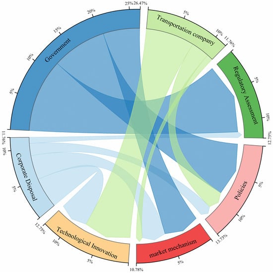 This section organizes the key actors and governance tools involved in transboundary waste management research and presents them in a chord diagram, as shown in Figure 5. The actors specifically include governments, transport enterprises, and disposal enterprises. Owing to variations in the literature descriptions of entities involved in waste treatment, this section consistently categorizes all entities directly engaged in final waste disposal as disposal enterprises to ensure analytical consistency. The core categories encompass enterprises focused on landfilling and incineration, as well as resource recovery enterprises. Governance tools are summarized into four types: regulatory assessment, policy and legislation, market mechanisms, and technological innovation. Figure 5 shows that government actors flow into three types of governance tools. Among these tools, policy assessment is the most frequently discussed governance tool for government actors in existing research. Transport enterprises utilize three types of governance tools, although policy evaluation is absent from their portfolio, with technological innovation being the most prevalent. Disposal enterprises comprehensively employ all four governance tools, with technological innovation also being the most frequently utilized. This finding demonstrates that technological capability serves as a critical indicator of corporate competitiveness. Therefore, enterprises should intensify innovation investments while enhancing brand reputation and fostering collaborative linkages across regions.