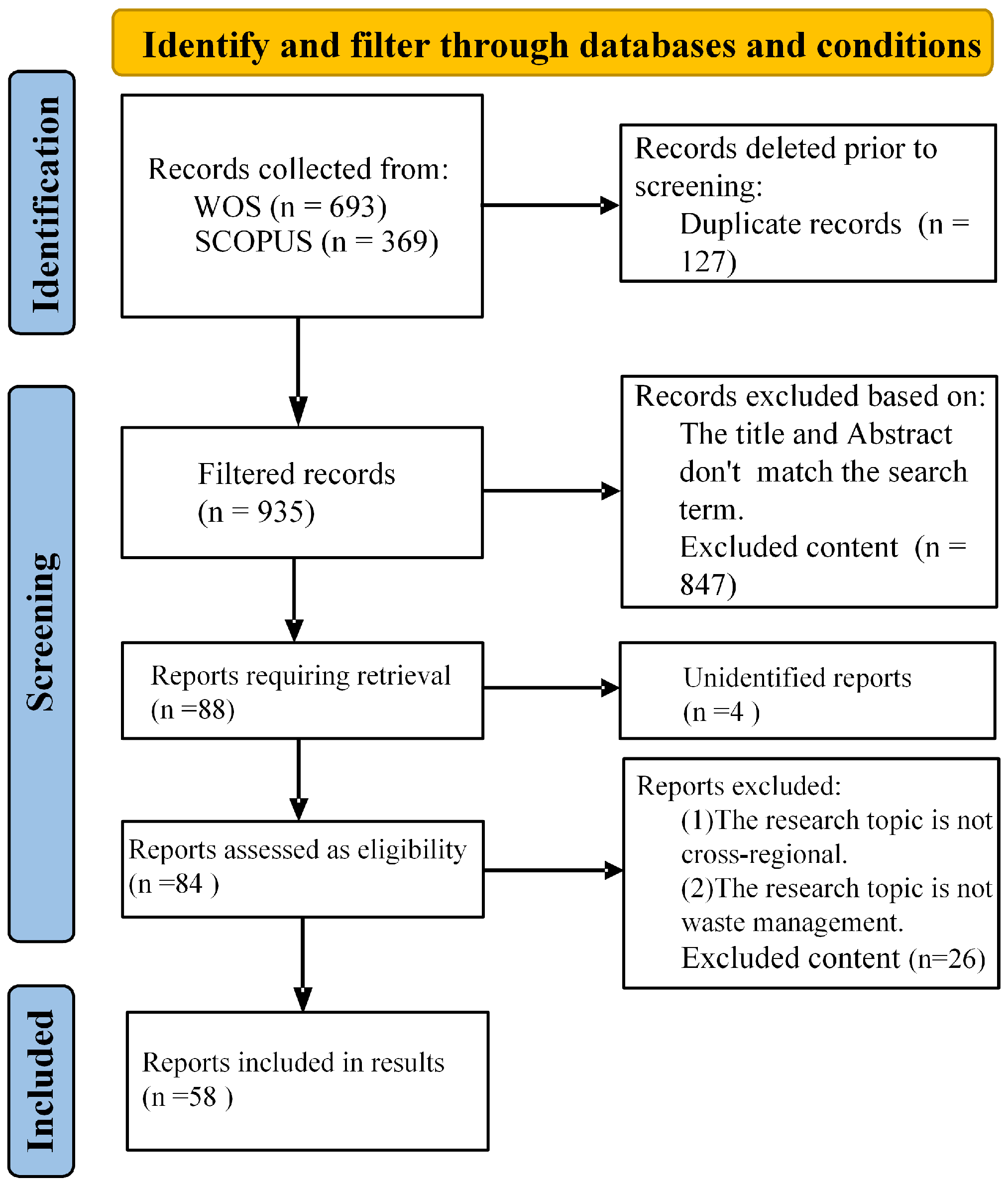 | Scopus search: TITLE-ABS-KEY (“cross-regional” OR “cross regional” OR “cross-region” OR “cross region” OR “inter-regional” OR “transboundary” OR “interjurisdictional” OR “intermunicipal” OR “inter-state” OR “cross-border”) AND TITLE-ABS-KEY (“waste manage*” OR “waste disposal” OR “waste treat*”) AND (LIMIT-TO (LANGUAGE, ‘English’)) | - |