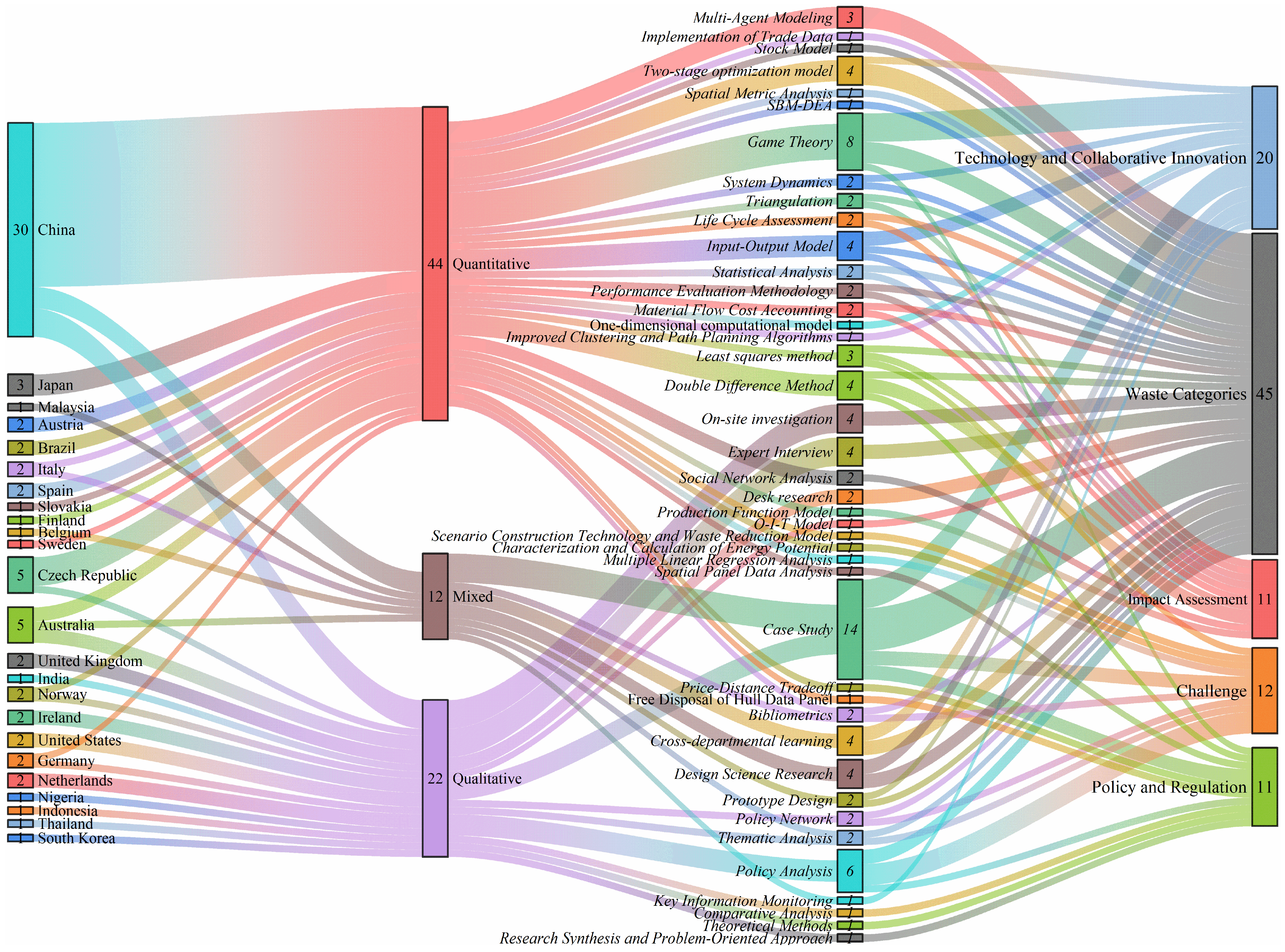 | Cross-regional management of specific types of waste | Construction waste | Field investigation; Expert interviews; Expert workshops; Desk research; Spatial measurement analysis; Gray forecasting; Material flow cost accounting; SBM-DEA model; Case studies; Key Informant Monitoring approach; System dynamics; Evolutionary game theory; Cross-departmental learning; Design science research; Prototyping; Life cycle assessment; Performance evaluation methods; Statistical analysis; Least squares method | Construction Industry | [30,32,33,34,38,40,41,50,51,52,53,54,55,56,57,58] |
