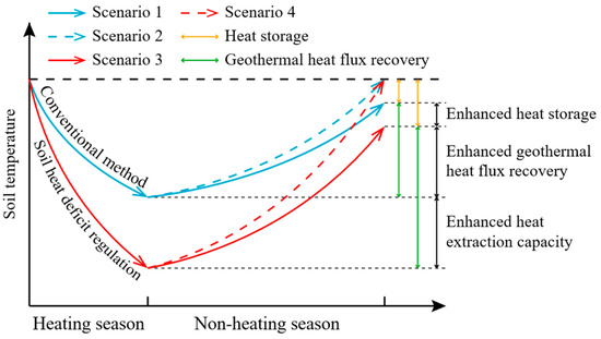 Schematic diagram of the cross-seasonal heat storage of the MDBHE based on the soil heat deficit regulation. Scenario 1—conventional method without heat storage; Scenario 2—conventional method with heat storage; Scenario 3—soil heat deficit regulation without heat storage; Scenario 4—soil heat deficit regulation with heat storage.