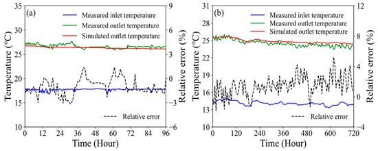 The MDBHE model developed in OGS has been previously validated through analytical solutions, numerical benchmarks, and field experiments [32]. In this study, further validation is carried out by comparing the simulation results with the measured data [33,34] (see Figure 2). In Figure 2a, slight fluctuations in the inlet and outlet temperatures were observed, which can be attributed to variations in outdoor ambient conditions and indoor heating demand. The comparison reveals a maximum relative deviation of 4% between the simulated and measured outlet temperatures. Figure 2b presents a comparison with 720 h of experimental data from another project, where the overall error is found to be less than 6%. Therefore, the developed numerical model is considered reliable for simulating heat transfer between the MDBHE and the surrounding soil, as well as for calculating soil temperatures and the inlet and outlet temperatures.