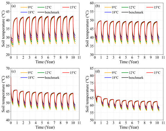 Variation in soil temperature under flow rate-based soil heat deficit regulation: (a) 500 m depth; (b) 1000 m depth; (c) 1500 m depth; (d) 2000 m depth.