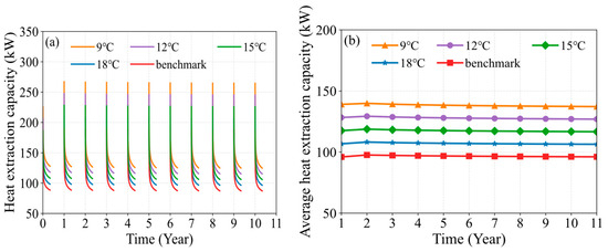 The variation in heat extraction temperature directly influences the heat extraction capacity of the MDBHE, as shown in Figure 4. Compared to the benchmark condition, a lower heat extraction temperature results in a greater increase in the heat extraction capacity of the MDBHE, with the most significant enhancement occurring at the start of the heating season. For example, at the beginning of the first heating season, compared to the benchmark condition, the heat extraction capacities at heat extraction temperatures of 18 °C, 15 °C, 12 °C, and 9 °C increased by 19.70 kW (13.41%), 39.38 kW (26.80%), 59.08 kW (40.21%), and 78.77 kW (53.61%), respectively. By the end of the first heating season, the heat extraction capacities at the same temperatures increased by 10.45 kW (11.12%), 19.69 kW (22.22%), 29.54 kW (33.34%), and 39.38 kW (44.45%), respectively, compared to the benchmark condition. This occurs because, when the heat extraction temperature is lowered, the temperature difference between the circulating fluid and the surrounding soil increases, leading to a significant increase in the heat extraction capacity of MDBHE.