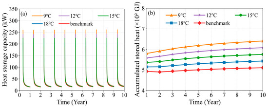 Variation in (a) heat storage capacity and (b) accumulated stored heat of the MDBHE under temperature-based soil heat deficit regulation.