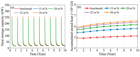 Variation in (a) heat storage capacity and (b) accumulated stored heat of the MDBHE under flow rate-based soil heat deficit regulation.