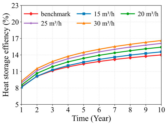 Variation in heat storage efficiency of the MDBHE under flow rate-based soil heat deficit regulation.
