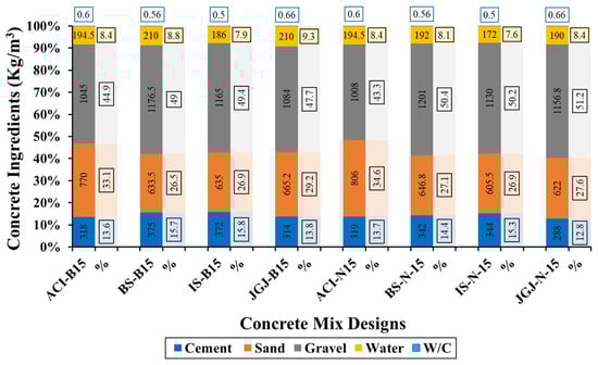 The goal of the CMD is to proportion the ingredients to produce durable concrete that satisfies the strength requirements at the lowest possible cost. For this reason, many countries have developed CMD codes based on the exposure requirements and the nature of the materials readily available in the region. In this study, the following four CMD codes were evaluated: the American Concrete Institute (ACI) code [70], the British (BS) code [71], the Indian (IS) code [72,73], and the Chinese (JGJ) code [74]. ACI, BS, IS, and JGJ are the acronyms used for the mentioned CMD codes. These CMD codes adopt different design methodologies, including empirical proportioning. These CMD codes were selected to reflect commonly used regional practices across different countries of the world and to evaluate performance differences in fresh and hardened concrete properties concerning aggregate type and ingredient proportioning methodologies. Concrete mixtures with a design strength of 25 MPa were proportioned according to the four CMD codes, respectively. Figure 1 shows the concrete mixtures prepared with basalt CA and natural CA. There are noticeable variations in the quantity of concrete components stated in these CMD regulations for NSC. For basalt CA, the BS code used the highest cement content, followed by IS, ACI, and JGJ. The highest water content was utilized by BS and JGJ, followed by ACI and IS codes. ACI had the highest sand content, whereas JGJ had a lower quantity of sand. There was virtually no difference between the IS and BS codes in terms of the quantity of sand. The largest amount of CA was used by BS, followed by IS, JGJ, and ACI. In the case of natural CA, the IS and BS codes had the highest cement concentration, followed by ACI and JGJ codes. The highest water content and sand content were used by ACI, followed by BS, JGJ, and IS codes. Compared with the other codes, BS had the highest CA content.