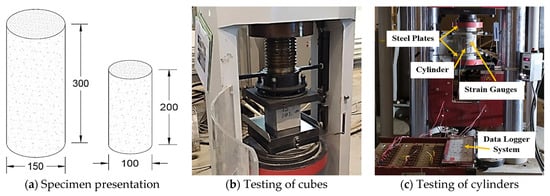 To measure the workability of concrete mixtures, slump tests were performed immediately, as the concrete mixtures were prepared in accordance with ASTM C143/C143M-15a [76]. Axial compression testing was conducted following the ASTM C39/C39M-15 [77]. A universal compression test machine with a capacity of 1000 MPa was used to measure the CS of the concrete cubes at a loading rate of 0.3 MPa/s. The cylinders were loaded at a steady rate of 0.3 mm/min in displacement-control mode. A 1000 kN servo-hydraulic machine was used to test the cylindrical specimens with a load drop of 100 kN/m2. The testing machine was calibrated within ±1.0 accuracy as per laboratory technician instructions. To measure deformation, two vertical and two horizontal strain gauges of 60 mm were attached at mid-height, i.e., at 150 mm and 100 mm marks from the top of the large and small cylinders, respectively. The specified areas for strain gauges installation were prepared using the appropriate sandpaper and cleaned with a solvent (acetone). The strain gauges were attached using locally available instant adhesive. Figure 2b,c depict the testing setup.