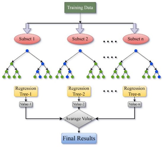Random Forest (RF) is an ensemble learning technique that builds a multitude of decision trees during the training phase and produces the class label (for classification) or the mean prediction (for regression) from the individual trees. RF enhances decision trees by minimizing variance, thereby increasing the model’s resilience to overfitting. RF generates a collection of decision trees, each trained on a random subset of features and a random portion of training data, i.e., via bootstrapping. The first RF-based method was presented in 1995, followed by an enhanced version released by Breiman [86]. These algorithms have been widely used in many different fields and have shown exceptional performance, especially in tasks like classification and regression [87]. Regression is a statistical learning theory-based methodology that extracts multiple samples from the original data using the bootstrap resampling technique [88]. The RF method improves the variety of decision trees by allowing the use of replacement samples and including random changes in predictor combinations during the development of individual trees [89]. Equation (10) shows how the predictions generated by each tree are averaged to obtain the final outcome. Figure 4 presents a flowchart of the RF model, demonstrating the bootstrap sampling method to generate several data subsets, the construction of decision trees from each subset, and the aggregation of their projected values to obtain a final prediction outcome. In Figure 4, the blue circles represent decision nodes where the data is split based on features, while the green circles represent leaf nodes that provide the final predictions in the regression trees.