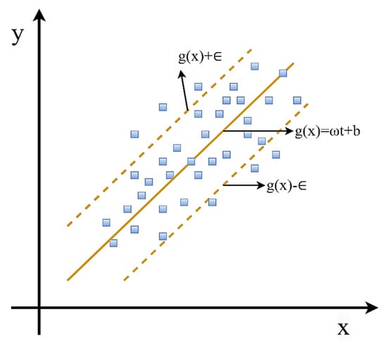 where ω is a vector that defines the gradient of the fitted line; C is the regularization parameter; L (ti, g(xi)) is the insensitive loss function; ζi+, ζi− (I = 1, 2, …, n) are slack variables for deviations above and below the δ margin; δ is a coefficient related to the interval band; g(xi) is a fitted value; and ti is a sample true value.