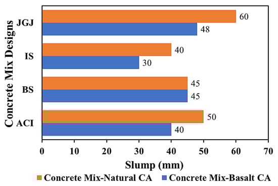 Slump tests were conducted to determine the functionality of fresh concrete. The slump results are shown in Figure 6. The ACI, BS, IS, and JGJ mixtures made of basalt CA provided slump results within the ranges specified by the CMD codes, i.e., 40 mm, 45 mm, 30 mm, and 48 mm, respectively. The ACI, BS, and IS mix designs using natural CA achieved the targeted slump results as per the respective mix design codes, i.e., 50 mm, 45 mm, and 40 mm. The JGJ concrete mixture had a maximum slump value of 60 mm, which was slightly higher than the specified range. The JGJ concrete mixture achieved higher slump value due to the higher water content, whereas the IS mixture had the lowest slump value due to the lower water content. In both cases, when basalt CA and natural CA were utilized, the BS concrete offered the same slump, i.e., 45 mm. The ACI, IS, and JGJ mixtures with natural CA offered 20%, 25%, and 20% higher slump values than those with basalt CA. According to the comparison, it is clear that the CA type, shape, and water content in the mixture play a crucial role in determining the workability of fresh concrete. Moreover, the lower workability of fresh concrete mixtures containing crushed basalt CA resulted in higher CS of hardened concrete.
