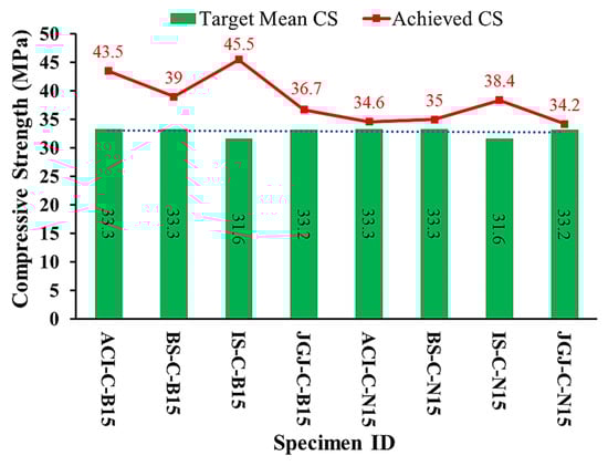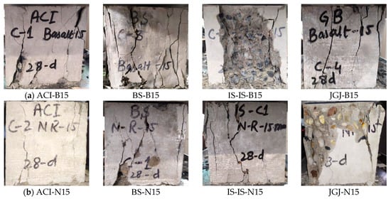 The target mean CS was calculated using Equations (14), (15), (16), and (17) specified by the ACI, BS, IS, and JGJ codes, respectively. Figure 11 presents the CS of cubes made with basalt and natural CA. The first letter of the specimen ID indicates the CMD code, the second letter indicates a cube, and the third letter represents the CA type of size 15 mm. Using basalt CA, the cubes of each CMD code surpassed the targeted mean CS. The ACI-C-B15, BS-C-B15, IS-C-B15, and JGJ-C-B15 specimens achieved 23.4%, 14.6%, 30.5%, and 8% higher CS than the designed CS, confirming the accuracy of the CMD calculations. In the case of natural CA concrete, the ACI-C-N15, BS-C-N15, IS-C-N15, and JGJ-C-N15 cubes exhibited 3.8%, 4.9%, 17.7%, and 3% higher CS than the designed CS, respectively, indicating the precision of the concrete mix proportion. The CS of cubes made with basalt CA was significantly higher than their counterparts made with natural CA. The ACI-C-B15, BS-C-B15, IS-C-B15, and JGJ-C-B15 presented 20.5%, 10.3%, 15.6%, and 7% higher CS than the cubes produced with natural CA of the same CMD codes, respectively. The explanation for the higher CS attained by the cubes of basalt CA is its shape, surface texture, and higher crushing strength, owing to a stronger interface bond developed between the matrix and basalt CA, resulting in a noticeably higher CS. The second cause is the W/C ratio, which is more influential in the case of concrete with natural CA.