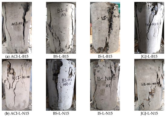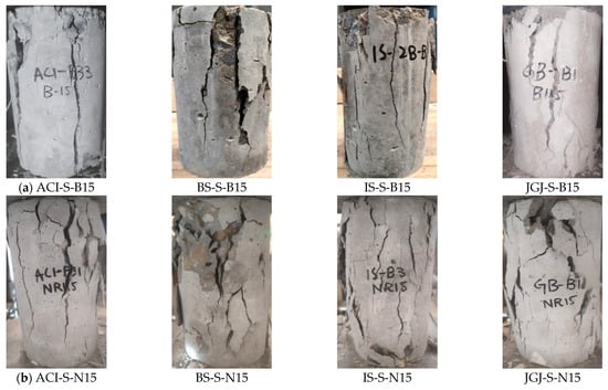 The experimental results for large and small cylinders incorporated with basalt and natural CA are presented in Table 2. Each result presents an average of three measurements. The variability in the CS results is indicated by the standard deviation (SD) and coefficient of variation (CV), calculated using Equations (18) and (19). Lower SD values suggest better consistency in the CS results. Similarly, lower CV values indicate less relative variability in the CS results compared to the mean result. In the ID of the specimens, the first letter indicates the CMD code, the second letter, L or S, shows the size of the cylinder, and the third letter, B15 or N15, indicate the CA type and size. The cylinders of the basalt CA offered notably higher CS than the cylinders of the natural CA in each of the four CMD codes. In the category of large cylinders, ACI-L-B15, BS-L-B15, IS-L-B15, and JGJ-L-B15 offered 30%, 25.5%, 39%, and 37% higher CS than their counterparts. In the case of small cylinders, ACI-S-B15, BS-S-B15, IS-S-B15, and JGJ-S-B15 achieved 33.4%, 16.3%, 40%, and 37% higher CS, respectively, than the small cylinders of the natural CA. The CS varies with the cylindrical dimensions as the large cylinders exhibited higher CS than the smaller cylinders. The large cylinders, i.e., ACI-L-B15, BS-L-B15, IS-L-B15, and JGJ-L-B15, offered 7%, 19%, 9%, and 8% higher CS, respectively, than the small cylinders. The same tendency was found for the large cylinders prepared with natural CA, i.e., ACI-L-N15, BS-L-N15, and IS-L-N15 achieved 11.6%, 9%, 10.8%, and 10% higher CS than the smaller ones. The large cylinders JGJ-L-N15 attained the same CS as the small cylinders JGJ-B-N15. The specimen size-related trend in the present study, i.e., larger cylinders attained higher CS than smaller cylinders is consistent with several earlier findings in the literature [94,95,96,97]. Concrete with basalt CA offered significantly higher CS than natural CA concrete due to its higher crushing strength, shape, and surface texture. All these properties are involved in providing a strong connection between the cement matrix and CA, which results in superior compression characteristics. The results also revealed the cylindrical specimen size effect on the CS of NSC.