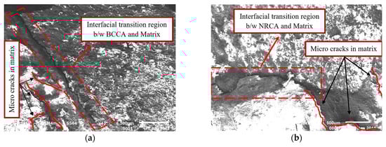 During axial compressive loading, the initial cracks developed at the top region of the specimens and propagated downwards. As the peak load (Pmax) was reached, the loading rate decreased gradually, and an uneven crack structure was established with diagonal and vertical columnar macro cracks. With attentive observation during testing, the first crack in the cylindrical specimens made with basalt CA and natural CA appeared at approximately 65% and 50% of their respective Pmax. The crack aspect ratios at Pmax for large cylinders and small cylinders of basalt CA were 0.75 and 0.85, respectively, whereas the aspect ratios of cracks at Pmax for large and small cylinders made with natural CA were 0.82 and 0.85, respectively. Longitudinal splitting in columnar pattern failure was observed along the direction of load application in the cylindrical specimens. For the cube specimens, failure occurred in a vertical pattern, diagonal shear occurred from top to bottom, and the matrix also flaked from the sides, as shown in Figure 7a,b. The failure modes of the cylindrical specimens are illustrated in Figure 8 and Figure 9. The failure patterns of the cylindrical specimens are interpreted and compared with the listed failure patterns in ASTM C39 [77]. Cylinders with basalt CA mainly displayed Type 3 failure pattern (columnar/shear), which indicates robust interlock of aggregates and increased friction along the cracks. Type 1 and Type 2 (cone and split) failure patterns were more common in cylinders with natural CA, particularly in the smaller cylinders. These failures are associated with reduced interlock and smoother aggregate surface. Due to less end constraint and better stress distribution, large cylinders often displayed more symmetric and consistent failure modes (Type 3 failure modes). All the detected failure modes fit within permitted patterns, demonstrating appropriate testing arrangement and acceptable failure reactions. After the test, the inner cross-sections were examined. Debonding between CA and matrix occurred mainly in the specimens prepared with natural CA, and crushing of the aggregates was also detected. Less debonding was observed in the case of basalt CA specimens, but in some cases, the CA were also crushed. Scanning electron microscopic (SEM) examination was performed to evaluate the microstructural behavior of the tested specimens, as shown in Figure 10. The interfacial transition zone (ITZ) was identified as the main area of vulnerability. It was characterized by a noticeable detachment between the aggregates and the cement matrix. This area, distinguished by porosity and micro-voids, enables the initiation and spread of cracks. The observed cracking patterns indicate that fractures spread along the weakest channels, such as the ITZ and pre-existing microcracks. This ultimately results in aggregate fracture and matrix collapse. In addition to SEM analysis, the qualitative visual examination of the fractured surfaces revealed that matrix cracking and ITZ debonding were the primary causes of failure, with aggregate fracture occurring in approximately 12% to 18% of the failure surface, indicating that matrix-controlled failure predominated. Specimens with basalt CA provided stronger interface bonds due to their angular shape and rough surface texture compared to natural CA.