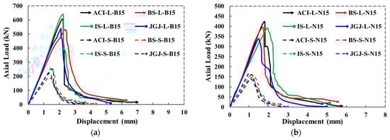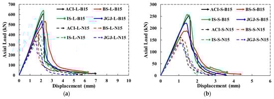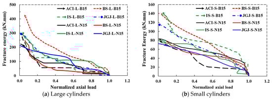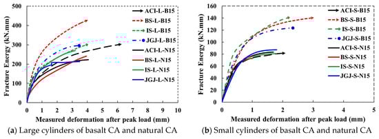 The post-peak fracture energy (GF) is computed from the peak load point to the lowest point of the load as the region under the load–displacement curve. It concerns concrete’s ability to resist applied compressive load after exceeding the Pmax. Table 2 presents the GF results for large and small cylinders made with basalt CA and natural CA. The results indicated that the specimens fabricated with basalt CA exhibited significantly higher GF than the specimens prepared with natural CA. In the category of large cylinders, ACI-L-B15, BS-L-B15, IS-L-B15, and JGJ-L-B15 offered 26.8%, 43.7%, 9.8%, and 28% higher GF than ACI-L-N15, BS-L-N15, IS-L-N15, and JGJ-L-N15, respectively. In the case of small cylinders, the specimens prepared with basalt CA had an improved GF compared to those made with natural CA. Due to catastrophic failure at the maximum load, small cylinders had lower GF. The specimens ACI-S-B15 and ACI-S-N15 achieved the same GF, whereas BS-S-B15, IS-S-B15, and JGJ-S-B15 attained 48%, 44.5%, and 29.2% improved GF compared with BS-S-N15, IS-S-N15, and JGJ-S-N15, respectively. The resultant GF curves of large and small cylinders are illustrated in Figure 16a,b.