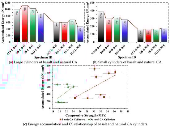 The whole cumulative area beneath the load–displacement curve was calculated as the accumulated energy (GA). The results of the GA of cylinders made with basalt CA and natural CA are given in Table 2 and Figure 15a,b. The results clearly show that the cylinders prepared with basalt CA exhibited significantly higher GA than their counterparts made with natural CA. In the category of large cylinders, ACI-L-B15, BS-L-B15, IS-L-B15, and JGJ-L-B15 offered 38.4%, 46.6%, 33.7%, and 47% higher GA than ACI-L-N15, BS-L-N15, IS-L-N15, and JGJ-L-N15, respectively. Similarly, the smaller cylinders of basalt CA, i.e., ACI-S-B15, BS-S-B15, IS-S-B15, and JGJ-S-B15, achieved 57%, 44%, 48%, and 37% higher GA than their counterparts made with natural CA. The results confirmed the significant impact of CA type and shape on the energy dissipation of circular cross-sections. Furthermore, the scatter plot in Figure 15c clearly shows a positive correlation between GA and CS, with basalt CA cylinders showing significantly greater GA than natural CA cylinders, indicating greater resistance against axial compressive load. The strength–energy relationship trend indicates that the improved GA capacity is positively correlated with higher CS.