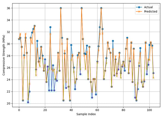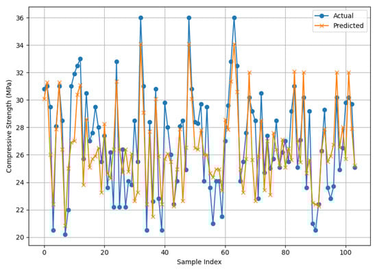 A correlation matrix, as illustrated in Figure 12, is produced to better understand how concrete mixture proportioning factors affect CS. The ingredients’ positive correlations are indicated in red, whereas negative correlations are shown in blue, and the color intensity represents correlation magnitude. The matrix depicts the linear connections between important factors of mix design and CS. The CA type has the strongest positive association with CS, underscoring that concrete CS capacity is greatly influenced by CA source, type, and shape. Furthermore, a relatively strong positive connection is discovered between cement content and CS, showing that larger cement fractions lead to increased CS. On the other hand, W/C ratio showed a moderate negative relationship with CS, confirming the classical concrete behavior. Increased porosity and poor past quality are common outcomes of higher W/C ratios, which results in reduced CS. The water content displayed a slightly negative effect on CS. A higher water quantity in the mix can dilute the cement paste, although the W/C ratio is more important in strength performance than water alone. The aggregate content (sand and gravel) reveals insignificant relationships, suggesting that within the investigated limits, their impact on CS is minor. This investigation confirms that CA type and cement–paste ratio have a major impact on concrete CS, with water content and aggregate amount having minor impacts. This correlation structure validates the findings of the experimental program.