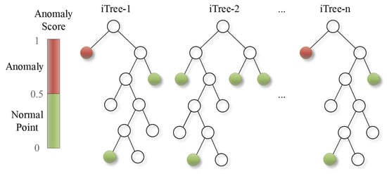 The anomaly detection process in iForest consists of two phases: the training phase and the evaluation phase. The training phase constructs multiple isolation trees (iTrees) to form the iForest for subsequent anomaly detection, while the evaluation phase uses the trained iForest to calculate anomaly scores and identify anomalies. Assuming the dataset is where each sample has dimensions, and the maximum depth of an iTree is set as , the algorithm proceeds as follows: