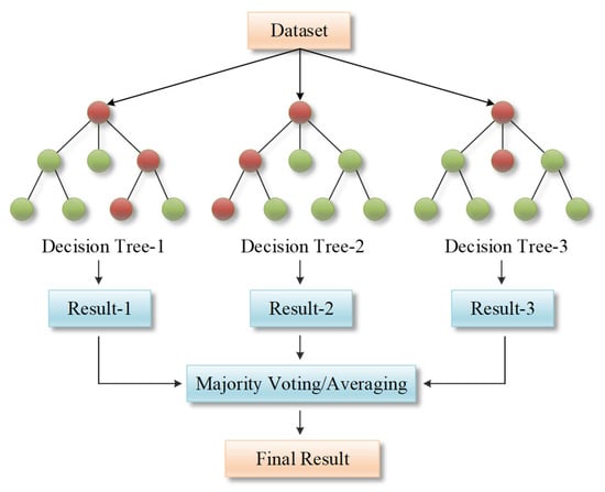 Random Forest (RF) is a machine learning algorithm based on ensemble learning [40], which improves model performance and robustness by constructing multiple decision trees and combining their prediction results. As shown in Figure 4, the core idea of RF lies in introducing randomness to generate diverse decision trees and integrating the prediction results of these trees through voting or averaging, thereby reducing the risk of overfitting of a single decision tree and enhancing the model’s generalization ability.