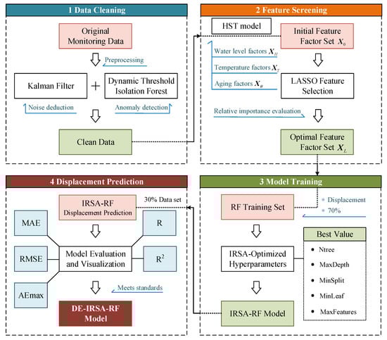 Dam displacement monitoring is crucial for assessing structural safety; however, conventional models often prioritize single-task prediction, leading to an inherent difficulty in balancing monitoring data quality with model performance. To bridge this gap, this study proposes a novel two-stage analytical framework that synergistically integrates an improved isolation forest (iForest) with a metaheuristic-optimized random forest (RF). The first stage focuses on data cleaning, where Kalman filtering is applied for denoising, and a newly developed Dynamic Threshold Isolation Forest (DTIF) algorithm is introduced to effectively isolate noise and outliers amidst complex environmental loads. In the second stage, the model’s predictive capability is enhanced by first employing the LASSO algorithm for feature importance analysis and optimal subset selection, followed by an Improved Reptile Search Algorithm (IRSA) for fine-tuning RF hyperparameters, thereby significantly boosting the model’s robustness. The IRSA incorporates several key improvements: Tent chaotic mapping during initialization to ensure population diversity, an adaptive parameter adjustment mechanism combined with a Lévy flight strategy in the encircling phase to dynamically balance global exploration and convergence, and the integration of elite opposition-based learning with Gaussian perturbation in the hunting phase to refine local exploitation. Validated against field data from a concrete hyperbolic arch dam, the proposed DTIF algorithm demonstrates superior anomaly detection accuracy across nine distinct outlier distribution scenarios. Moreover, for long-term displacement prediction tasks, the IRSA-RF model substantially outperforms traditional benchmark models in both predictive accuracy and generalization capability, providing a reliable early risk warning and decision-support tool for engineering practice.