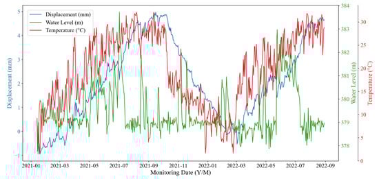 As critical infrastructures in hydraulic engineering, dams profoundly impact public safety and regional economic development, with their performance directly dependent on structural integrity and operational reliability. High-quality monitoring data is therefore essential for accurately assessing the structural health of these systems [1,2]. Among various monitoring metrics, dam displacement serves as a vital indicator of structural condition. Continuous monitoring and scientific prediction of displacement trends facilitate the early detection of potential risks, thereby effectively mitigating the likelihood of catastrophic failures [3]. Nevertheless, throughout their long-term service, dams undergo material aging and are simultaneously exposed to complex environmental factors, including variations in hydraulic pressure, seasonal temperature fluctuations, and geological activities. The interplay of these dynamic loads presents substantial challenges to displacement monitoring systems, wherein delayed warnings could potentially initiate cascading engineering disasters [4,5]. Consequently, the development of intelligent displacement monitoring and early-warning systems, supported by high-precision predictive models, has emerged as a crucial technological priority for ensuring dam safety over their entire lifecycle.